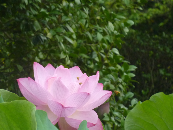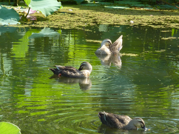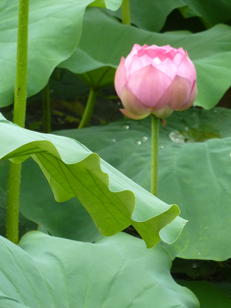 公園入ってしばらく進むと、池より先に蓮の花が頭をのぞかせていて